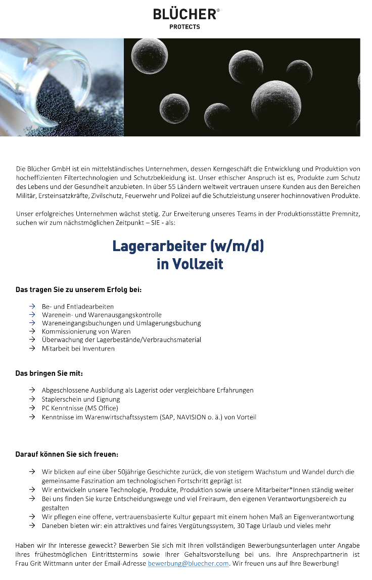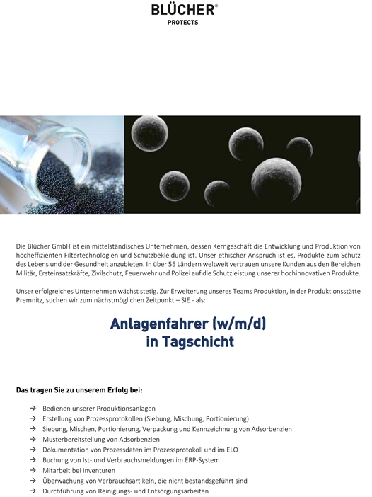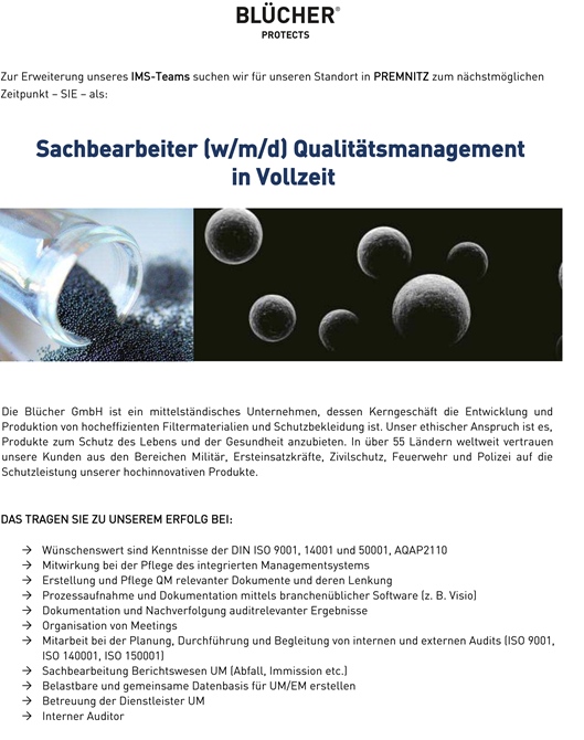 Blücher GmbH sucht Sachbearbeiter (m/w/d) im Qualitätsmanagement in Premnitz