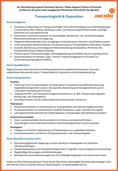 Zur Verstärkung unseres Customer-Service / Sales-Support-Teams in Premnitz