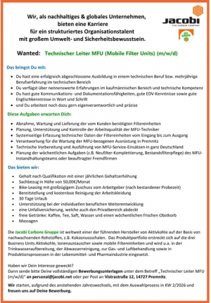 Stellenanzeige: Technischer Leiter MFU (Mobile Filter Units) (m/w/d) – Premnitz