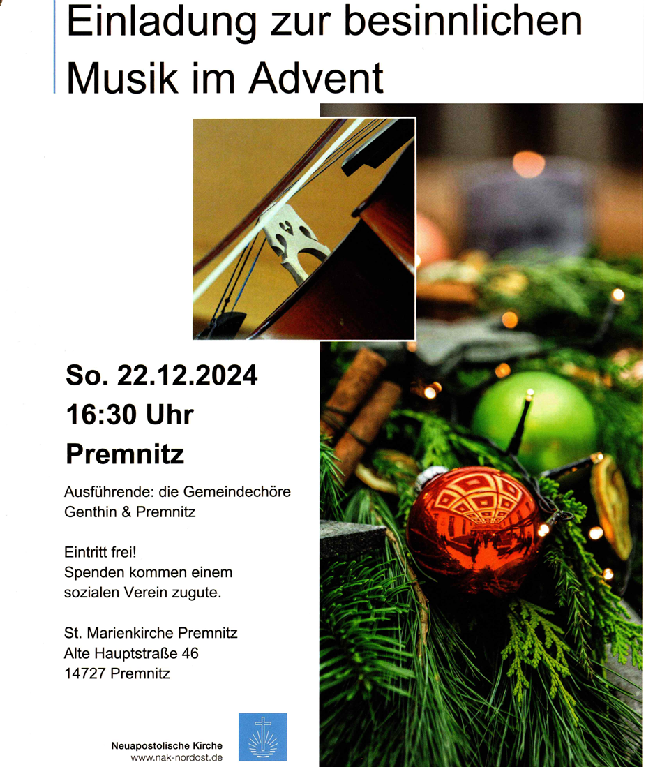 Zu ihrem diesjährigen Konzert zur Advents- und Weihnachtszeit lädt die neuapostolische Gemeinde Premnitz alle herzlich ein, die sich auf das bevorstehende Weihnachtsfest einstimmen lassen wollen. Am 4. Adventssonntag, dem 22. Dezember, beginnt das abwechslungsreiche Konzert um 16:30 Uhr in der katholischen Kirche zu Premnitz, Alte Hauptstraße 46.