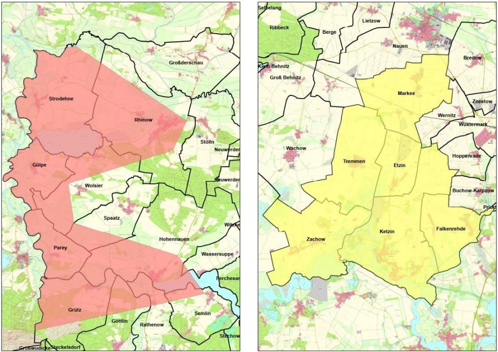 Im Havelland betrifft dies unter anderem das Territorium um die Niederung der unteren Havel/Gülper See, welches als Ramsar-Gebiet gelistet ist. Das Gebiet umfasst hauptsächlich die Gemeinde Havelaue mit den Ortsteilen Gülpe, Parey, Strodehne und den Gemeindeteil Prietzen, den Ortsteil Hohennauen der Gemeinde Seeblick, den Ortsteil Grütz und den Wohnplatz Albertsheim der Stadt Rathenow, die Stadt Rhinow mit dem Ortsteil Kietz und dem Wohnplatz Buchhorst. Außerdem betroffen sind die Stadt Ketzin/Havel mit den Gemarkungen Ketzin, Zachow, Falkenrehde, Tremmen und Etzin sowie die Gemarkung Markee der Stadt Nauen. Hierbei handelt es sich jeweils um Risikogebiete mit hoher Wildvogelpopulation, die gleichzeitig eine hohe Hausgeflügeldichte aufweisen. Alle Gebiete sind in zwei Karten als Anlage zur Allgemeinverfügung im Amtsblatt 42/2020 des Landkreises Havelland einzusehen.
