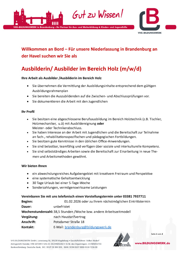 Ausbilder/in im Bereich Holz (m/w/d) gesucht – Brandenburg an der Havel