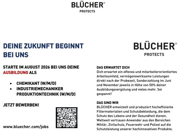 Das Unternehmen BLÜCHER bietet auch 2026 wieder attraktive Ausbildungsplätze an und öffnet motivierten Nachwuchskräften den Weg in eine sichere berufliche Zukunft. Der Ausbildungsstart erfolgt im August 2026 – und interessierte Bewerberinnen und Bewerber können sich ab sofort melden.