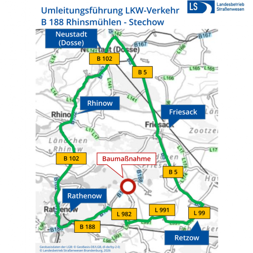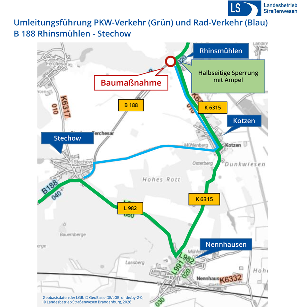 Ab Montag, 23. März 2026, kommt es im Bereich Rhinsmühlen (Havelland) zu erheblichen Einschränkungen auf der B188. Grund sind Bauarbeiten zur Erneuerung des Radwegs am Knotenpunkt zur Kreisstraße K6315.