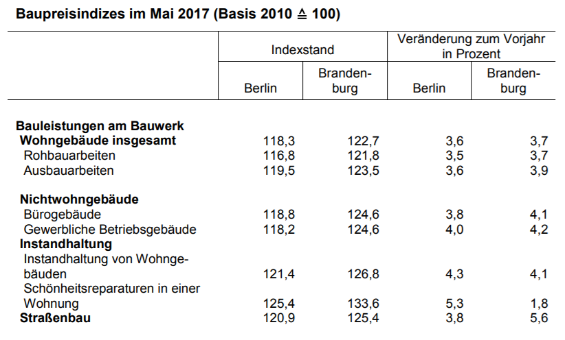 Auch die Preise für Instandhaltungsarbeiten, den Neubau von Nichtwohngebäuden und vor allem für den Straßenbau stiegen deutlich. Hier lagen die Preiserhöhungen im Vergleich zu Februar 2017 in Berlin zwischen 4,6 und 9,7 Prozent und in Brandenburg zwischen 5,4 und 9,1 Prozent.