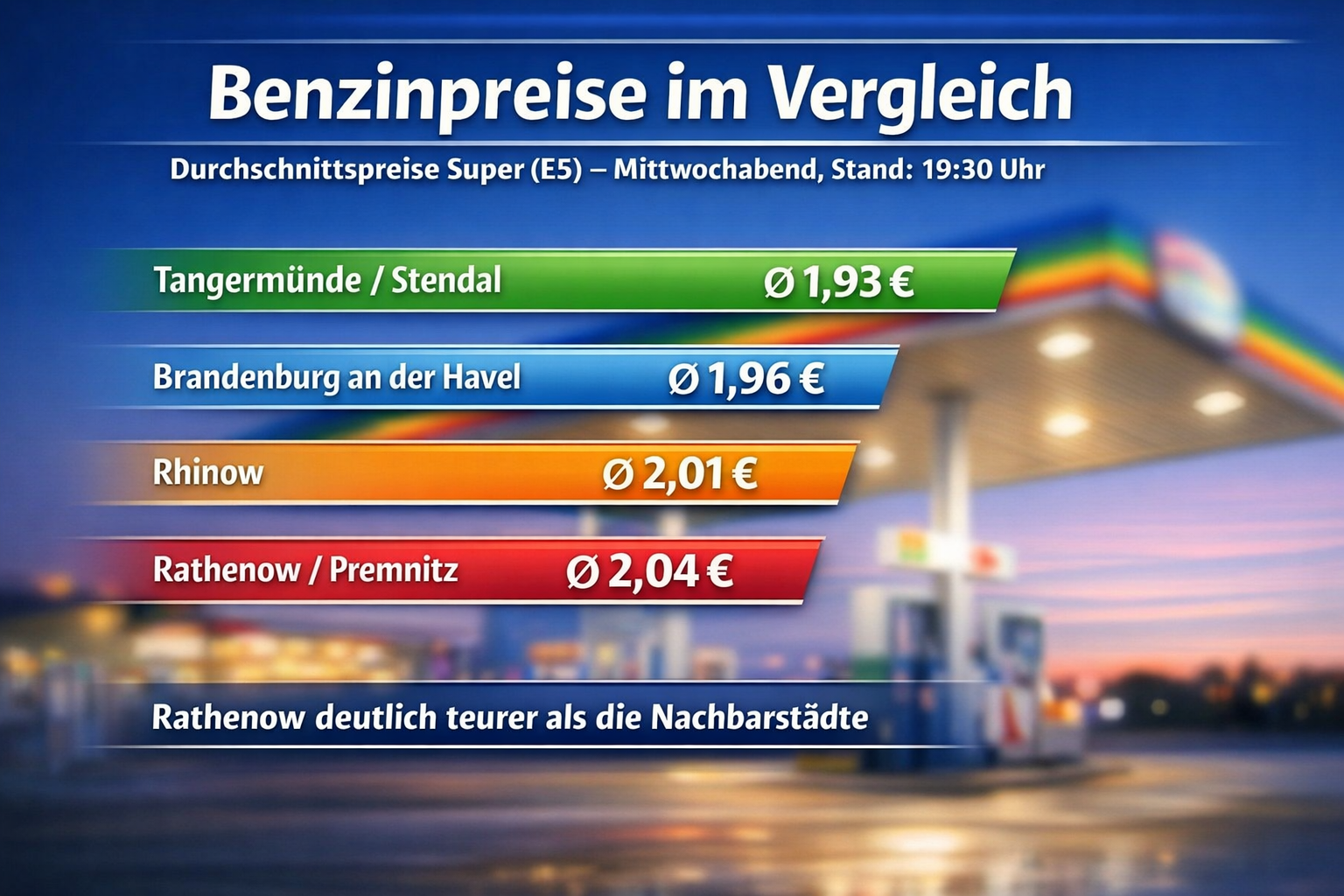 Damit liegt der Durchschnittspreis in Rathenow derzeit etwa 10 bis 12 Cent über dem Niveau in den Nachbarstädten.