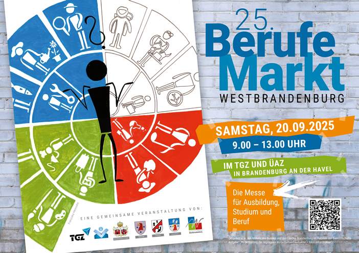 Am 20. September 2025 findet von 9:00 bis 13:00 Uhr der 25. Berufemarkt Westbrandenburg statt – eine der größten Messen zur beruflichen Orientierung im Land Brandenburg. Die Veranstaltung wird erneut im Technologie- und Gründerzentrum sowie im benachbarten Überbetrieblichen Ausbildungszentrum in Brandenburg an der Havel (Friedrich-Franz-Straße 16/19, 14770 Brandenburg an der Havel) ausgerichtet.
