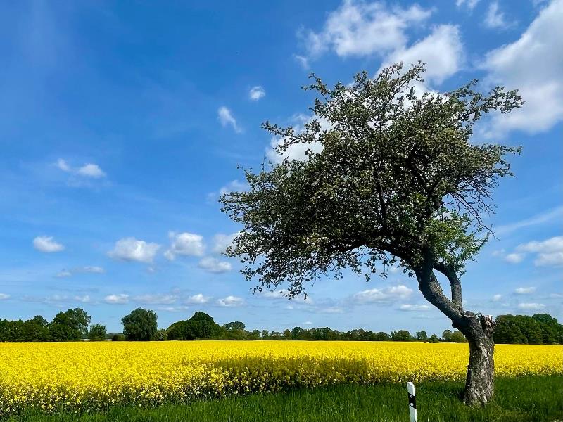 Ein blühender Baum vor einem gelben Rapsfeld, dazu ein klarer blauer Himmel – dieses stimmungsvolle Foto wurde in der Nähe von Semlin aufgenommen und zeigt die Landschaft im Havelland Anfang Mai von ihrer schönsten Seite.