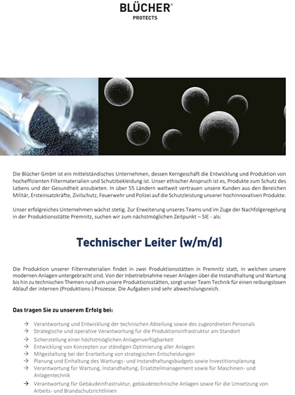 Blücher GmbH: Technischer Leiter (w/m/d) für den Standort Premnitz gesucht