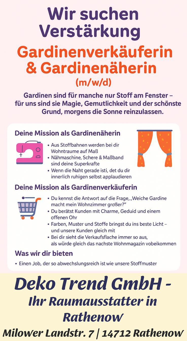 Deko Trend Rathenow sucht Verstärkung: Gardinenverkäuferin & Gardinennäherin (m/w/d)