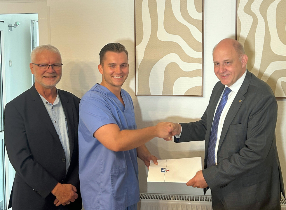 Im Beisein des Vorstandsvorsitzenden der Kassenzahnärztlichen Vereinigung des Landes Brandenburg, Herrn Dr. Steglich übergab Landrat Roger Lewandowski am 25.07.2024 erstmals einen Zuwendungsbescheid an einen Zahnmediziner. Dazu bemerkte Lewandowski: