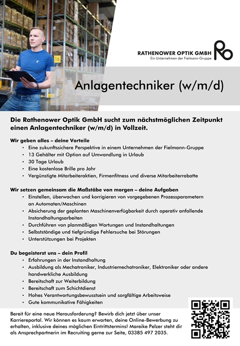 Die Rathenower Optik GmbH sucht zum nächstmöglichen Zeitpunkt einen Anlagentechniker (w/m/d) in Vollzeit
