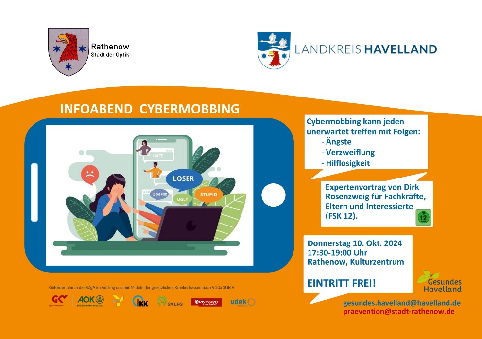 Cybermobbing kann jeden unerwartet treffen und hinterlässt oft tiefe Spuren: Ängste, Verzweiflung und Hilflosigkeit prägen den Alltag der Betroffenen. Um diese unsichtbare Gefahr besser zu verstehen und gezielt vorzubeugen, laden die Stadt Rathenow und der Landkreis Havelland zu einem Infoabend zum Thema Cybermobbing ein. Die Veranstaltung findet am Donnerstag, dem 10. Oktober 2024, von 17:30 Uhr bis 19:00 Uhr im Kulturzentrum, Märkischer Platz 3, in Rathenow statt und richtet sich an Fachkräfte, Eltern, Großeltern, Bezugspersonen von Kindern und Jugendlichen sowie alle Interessierten ab einem Alter von 12 Jahren. Der Eintritt ist kostenlos.