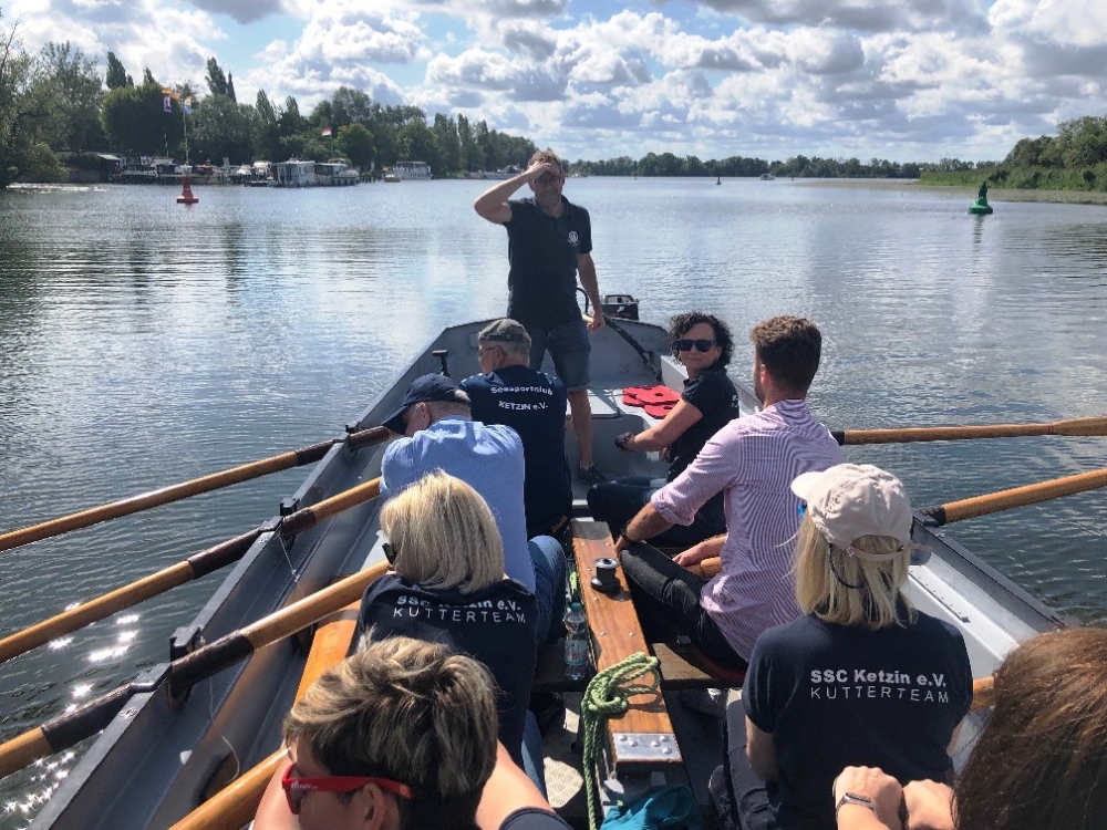 Im Anschluss stand die Vereinsarbeit im Fokus: Der Seesportclub Ketzin e.V., vertreten durch Vereinsvorstand Wilfried Luth, präsentierte seine Angebote und Aktivitäten. Besonders beeindruckt zeigte sich Landrat Lewandowski vom starken ehrenamtlichen Engagement und der Jugendarbeit. Von den insgesamt 75 Vereinsmitgliedern sind 17 unter 18 Jahre alt – organisiert in fünf aktiven Abteilungen. Die Clubmitglieder betreiben mit Leidenschaft Kutterrudern, eine Sportart, in der der Verein auf nationaler Ebene bereits mehrfach Podestplätze bei Deutschen Meisterschaften erzielen konnte. Der Landrat ließ es sich nicht nehmen, das Kutterrudern sogar persönlich auszuprobieren. Am Bootshaus des Vereins, in einer kleinen Marina, stehen zudem Liegeplätze für Segel- und Motorboote sowie für Flöße bereit. Auch Wasserwanderer mit Ruderboot oder Kanu finden hier eine Anlegemöglichkeit.