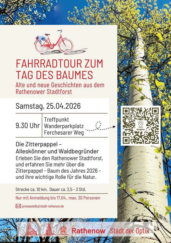 Anlässlich des Tags des Baumes lädt die Stadt Rathenow am Samstag, den 25. April 2026, zu einer geführten Fahrradtour in den Stadtforst ein. Unter dem Thema „Die Zitterpappel – Alleskönner und Waldbegründer“ erhalten Interessierte spannende Einblicke in die Bedeutung dieses besonderen Baumes sowie in alte und neue Geschichten aus dem Stadtforst. Die Tour beginnt um 9.30 Uhr am Wanderparkplatz Ferchesarer Weg, umfasst eine Strecke von etwa 10 Kilometern und dauert rund zweieinhalb bis drei Stunden. Die Teilnehmerzahl ist auf maximal 30 Personen begrenzt, eine Anmeldung ist bis zum 17. April per E-Mail an pressestelle@stadt-rathenow.de erforderlich.