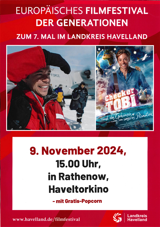 Am Samstag, dem 9. November 2024, ab 15.00 Uhr lädt die Stadt Rathenow ins Haveltorkino, Vor dem Haveltor 1, zu einem besonderen Kinonachmittag für die ganze Familie ein. Gezeigt wird der beliebte Film „Checker Tobi ... und das Geheimnis unseres Planeten“. Checker Tobi begibt sich dabei auf eine abenteuerliche Reise um die Welt, um das Geheimnis unseres Planeten zu lüften. Seine Entdeckungstour führt ihn von der Pazifikinsel Vanuatu über das ewige Eis Grönlands bis hin zur Unterwasserwelt vor Australien und in den Großstadtdschungel Indiens.