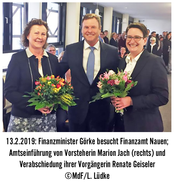 Nauen – Seit Juli 2018 steht die Leitende Regierungsdirektorin Marion Jach dem Finanzamt Nauen vor. Heute begrüßte Brandenburgs Finanzminister Christian Görke sie im Rahmen einer Feier mit vielen Partnern des Finanzamtes als Leiterin der Behörde.