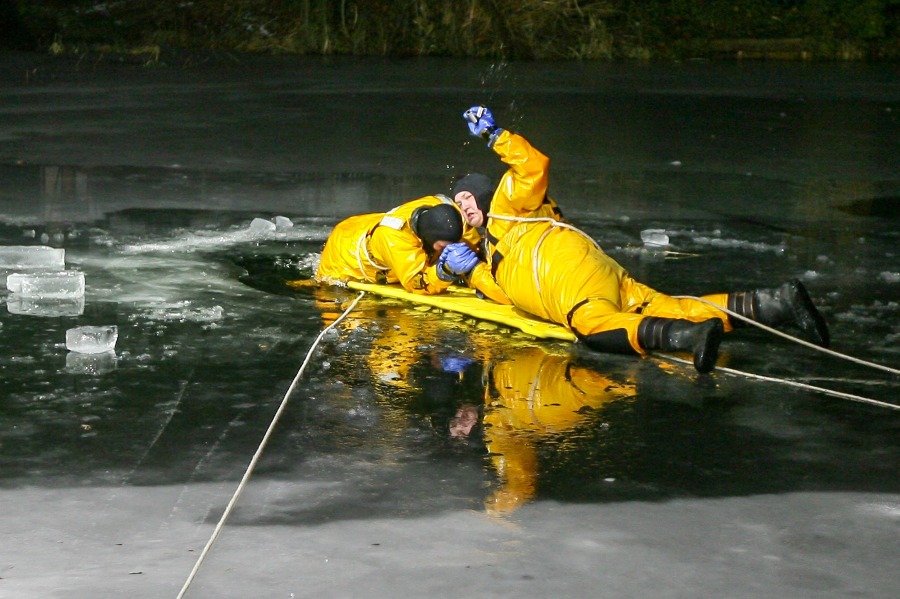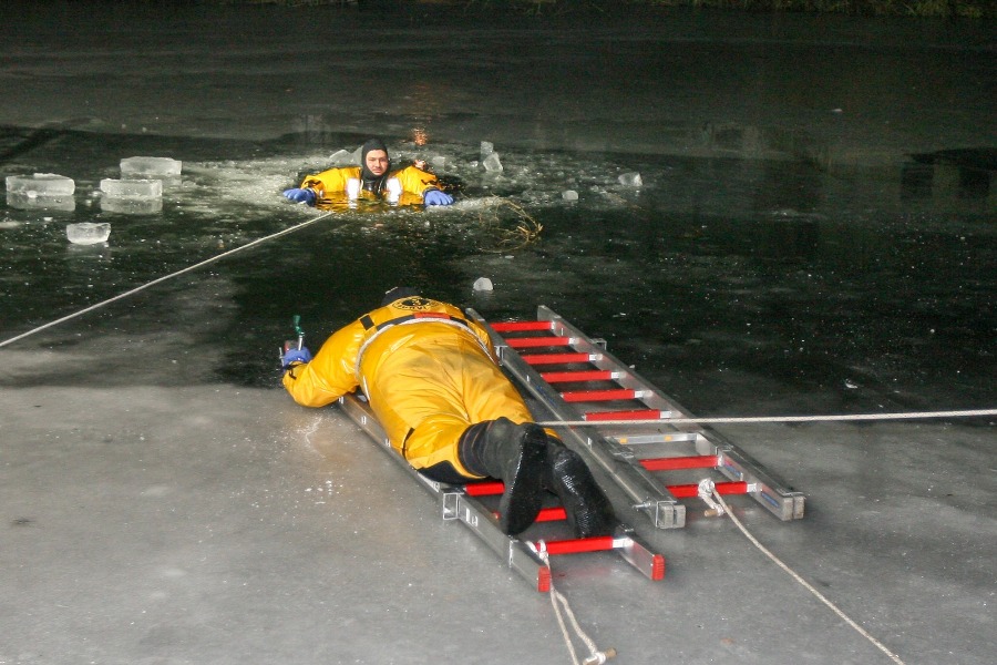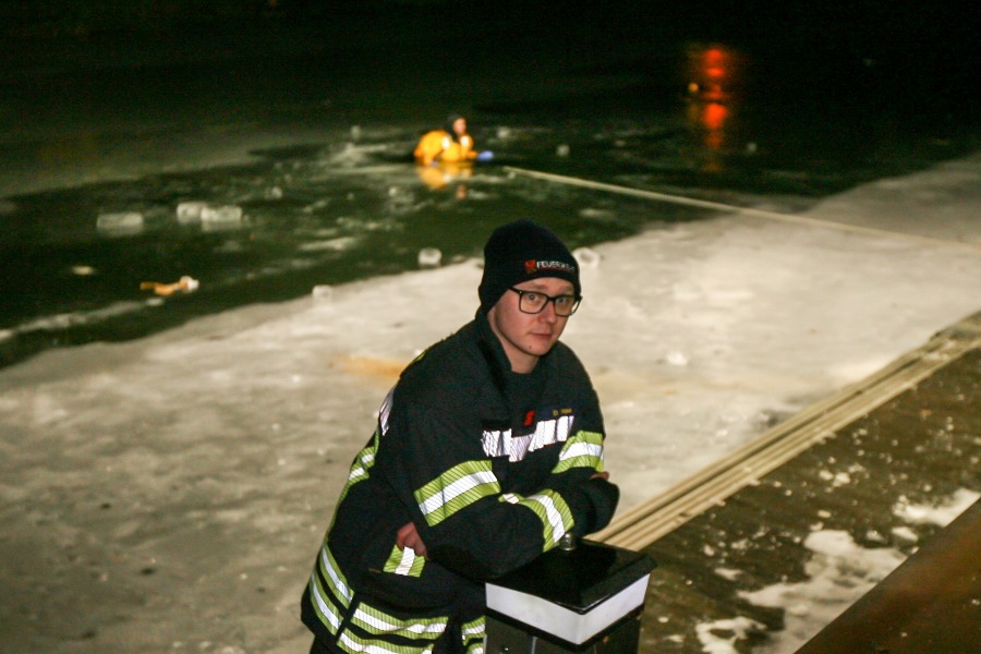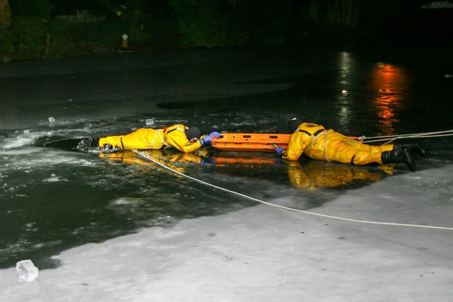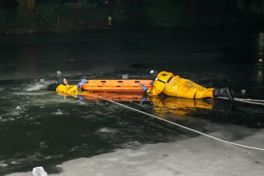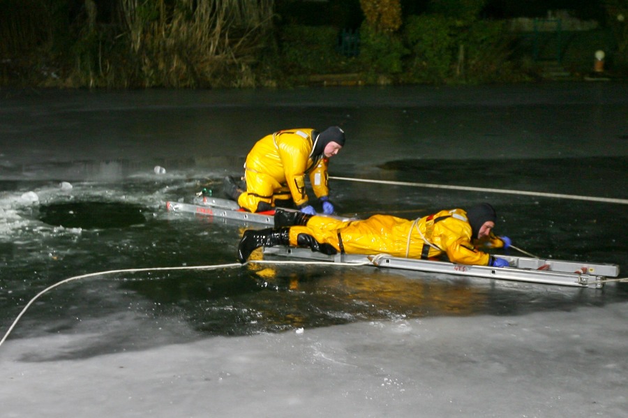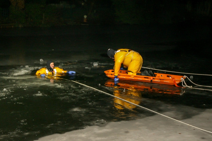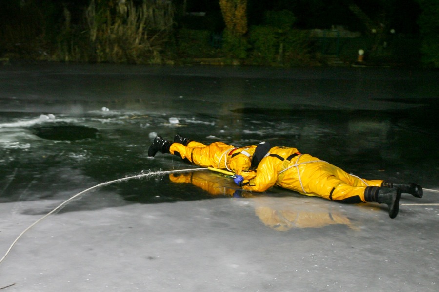 Für das Training begaben sich zwei Einsatzkräfte in speziellen Überlebensanzügen kontrolliert auf eine Eisfläche. Mit verschiedenen Rettungs- und Sicherungshilfsmitteln wurde die Rettung von eingebrochenen Personen realitätsnah geübt. Dabei kamen unter anderem Leinen, Leitern und Rettungsbretter zum Einsatz.