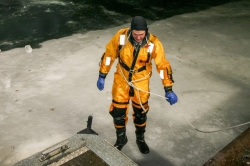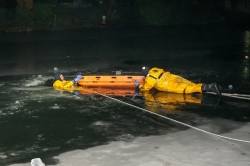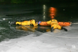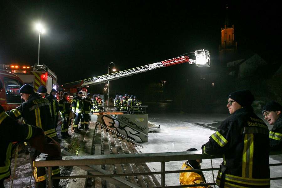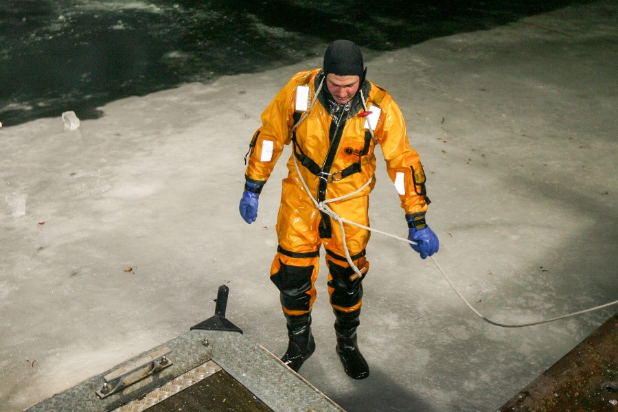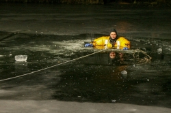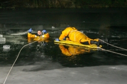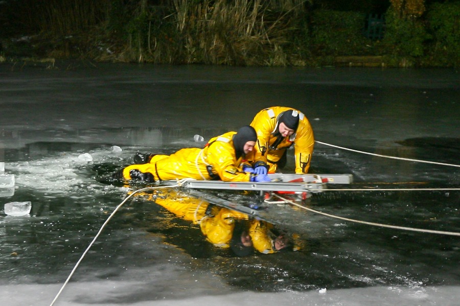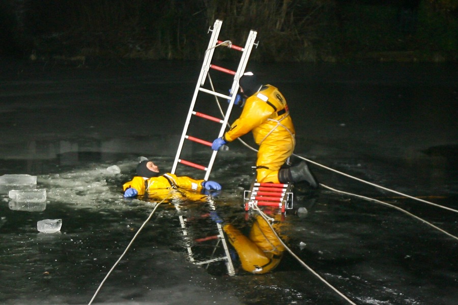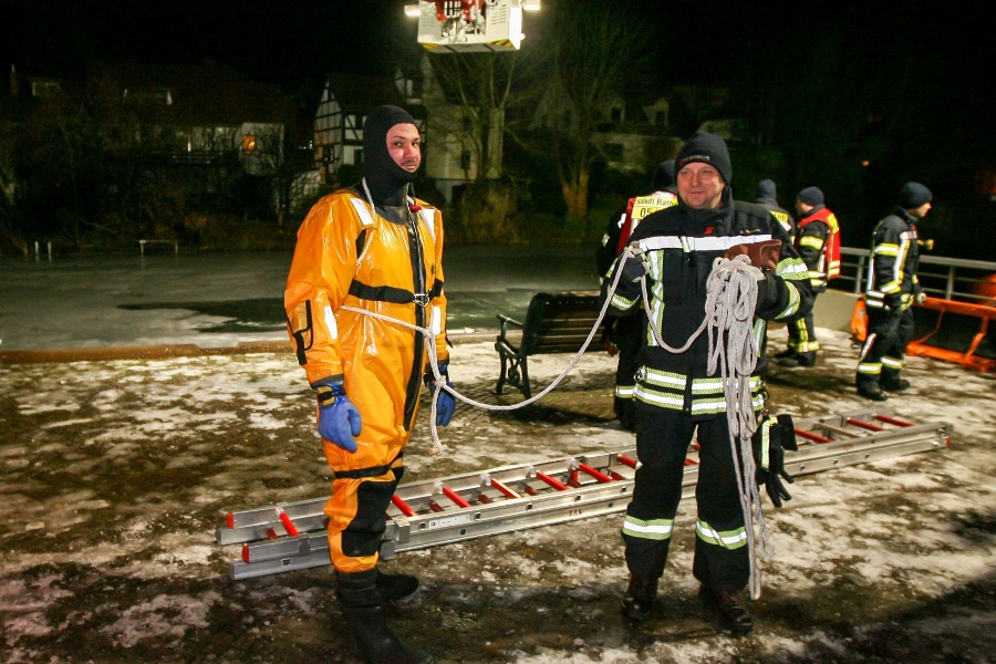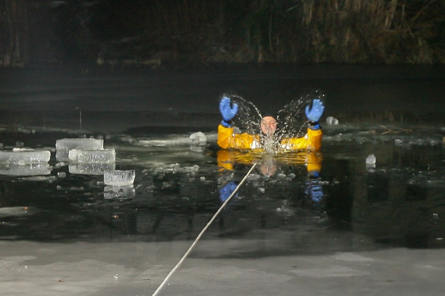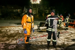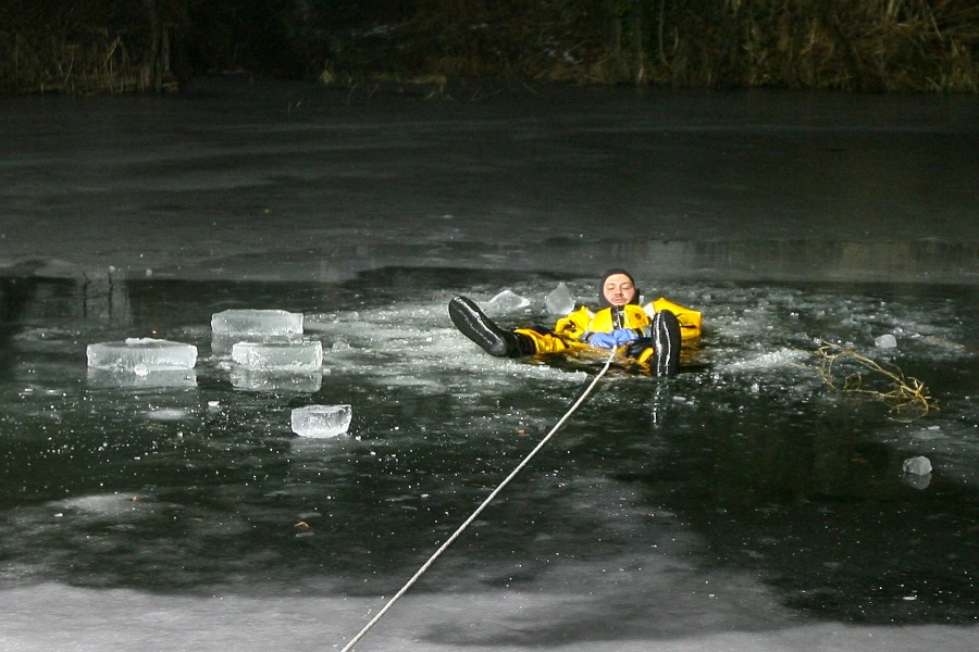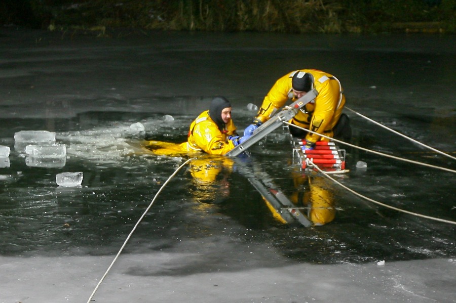 Für das Training begaben sich zwei Einsatzkräfte in speziellen Überlebensanzügen kontrolliert auf eine Eisfläche. Mit verschiedenen Rettungs- und Sicherungshilfsmitteln wurde die Rettung von eingebrochenen Personen realitätsnah geübt. Dabei kamen unter anderem Leinen, Leitern und Rettungsbretter zum Einsatz.
