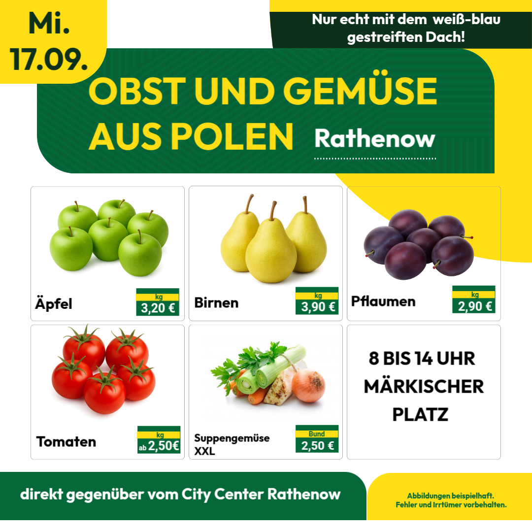 Am Mittwoch, den 17. September, ist es wieder soweit: Auf dem Märkischen Platz in Rathenow bietet der bekannte Stand mit dem weiß-blau gestreiften Dach frisches Obst und Gemüse aus Polen an.
