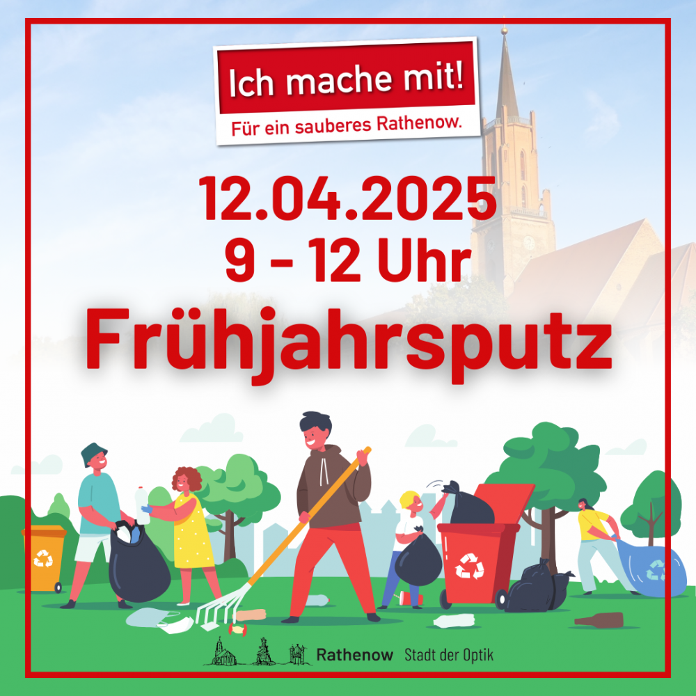 Am 12. April 2025 ruft die Stadt Rathenow im Rahmen der Aktion „Ich mache mit! Für ein sauberes Rathenow.“ zu einem Frühjahrsputz auf. Alle Bürgerinnen und Bürger sind herzlich eingeladen, sich in Eigeninitiative an der Aktion zu beteiligen und in der Nachbarschaft aufzuräumen, Müll zu sammeln und aktiv zur Verschönerung des eigenen Wohngebiets beizutragen.