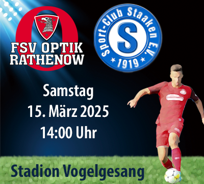 Am Samstag, den 15. März, trifft der FSV Optik Rathenow in der Oberliga auf den SC Staaken. Anpfiff der Partie ist um 14:00 Uhr im Stadion Vogelgesang in Rathenow.