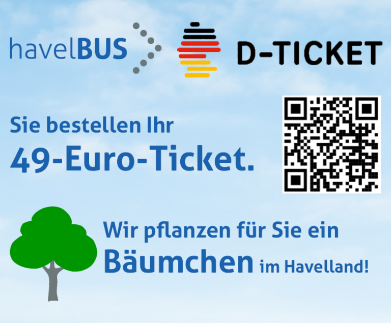 Im Zusammenhang mit dem D-Ticket haben wir eine besondere Umwelt-Aktion vorbereitet. Für jeden Kunden, der ein D-Ticket-Abo bei Havelbus abschließt, pflanzen wir ein Bäumchen in der Region. Diese Aufforstungsaktion ist bis 31. Juli 2023 begrenzt.