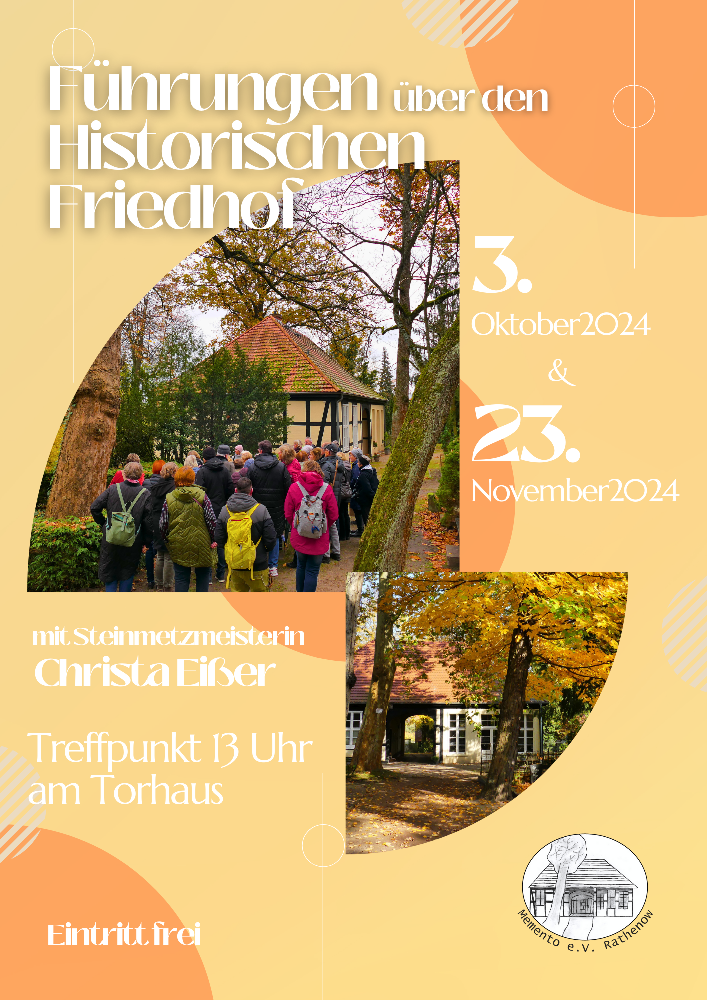 Christa Eißer führt am 03. Oktober (Donnerstag, Tag der Deutschen Einheit) und am 23. November (Samstag vor Totensonntag, 24.11.) jeweils ab 13 Uhr über den Weinbergfriedhof. Treffpunkt ist das Torhaus des evangelischen Friedhofs. Die Führung dauert ca. 2,5 Stunden. Der Friedhof ist Mitglied der „Stiftung Historische Friedhöfe und Kirchhöfe Berlin-Brandenburg“. Die Stiftung würdigt den Rathenower Friedhof als ein Kleinod und das Torhaus als ein Juwel, das seinesgleichen im Land Brandenburg sucht.