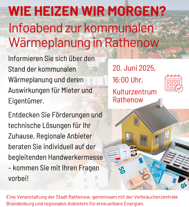 Die Stadt Rathenow lädt alle Bürgerinnen und Bürger herzlich zu einem Infoabend zur Kommunalen Wärmeplanung ein. Die Veranstaltung findet am Freitag, den 20. Juni 2025, ab 16.00 Uhr im Kulturzentrum Rathenow (Blauer Salon & Foyer) statt.