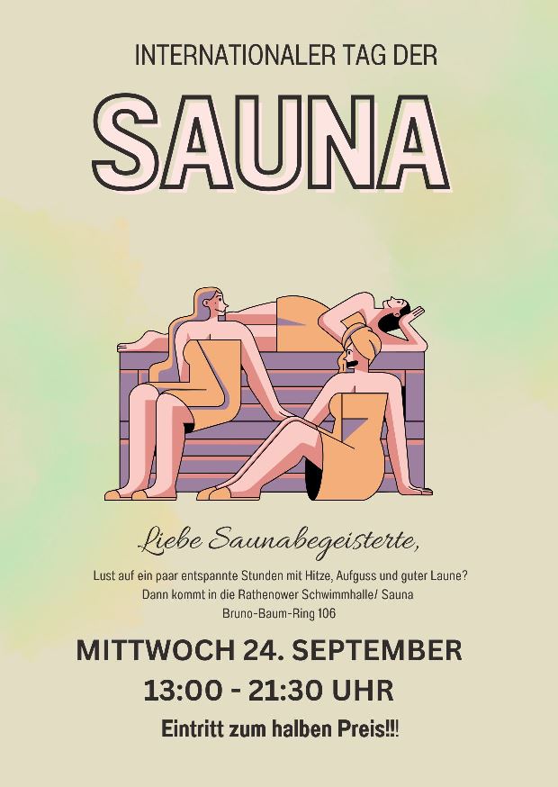 Rathenow – Am Mittwoch, den 24. September 2025, lädt die Rathenower Schwimmhalle anlässlich des Internationalen Tags der Sauna zu einem besonderen Angebot ein. Zwischen 13:00 und 21:30 Uhr können alle Besucherinnen und Besucher die Sauna zum halben Eintrittspreis nutzen.