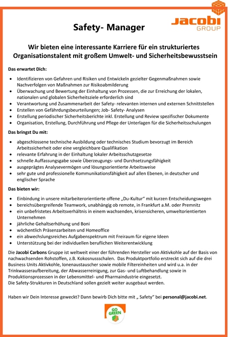 Jacobi Carbons Gruppe: Safety Manager (m/w/d) gesucht!