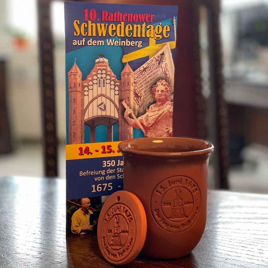 Anlässlich des 350. Jahrestages der Vertreibung der Schweden aus Rathenow präsentiert der Schwedentage e.V. ein besonderes Andenken: den exklusiven Jubiläumsweinbecher aus Ton. Es gibt ihn, genau wie die passenden Tonplaketten, käuflich zu erwerben für 5 Euro das Stück (Becher) sowie 3 Euro (Plakette). In der Prägung ist das Kurfürstendenkmal zu sehen, welches an die historischen Ereignisse am 15. Juni 1675 erinnert.