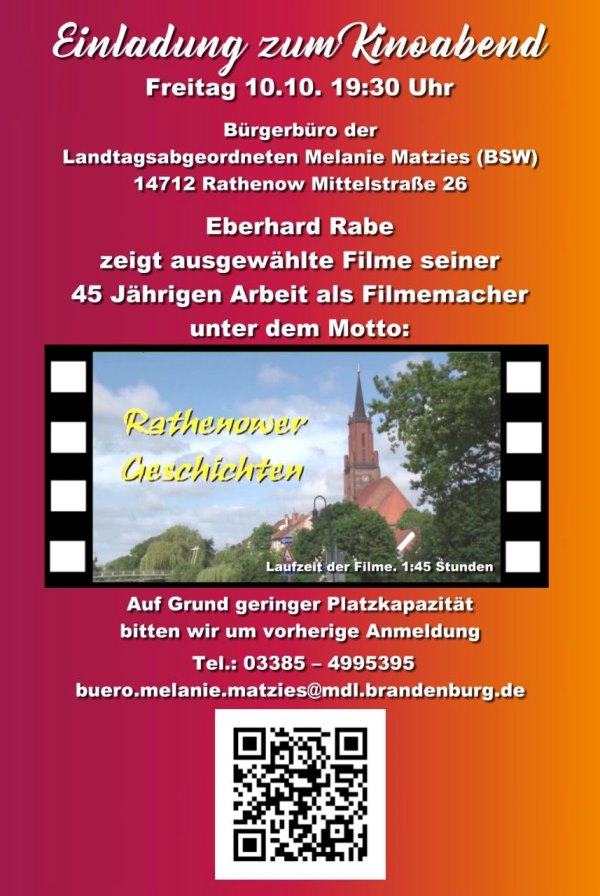 Am Freitag, 10. Oktober 2025, um 19:30 Uhr lädt das Bürgerbüro der Landtagsabgeordneten Melanie Matzies (BSW) in der Mittelstraße 26 in Rathenow zu einem besonderen Kinoabend ein.