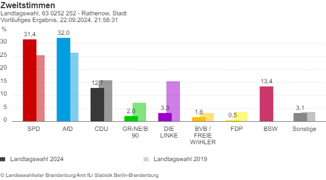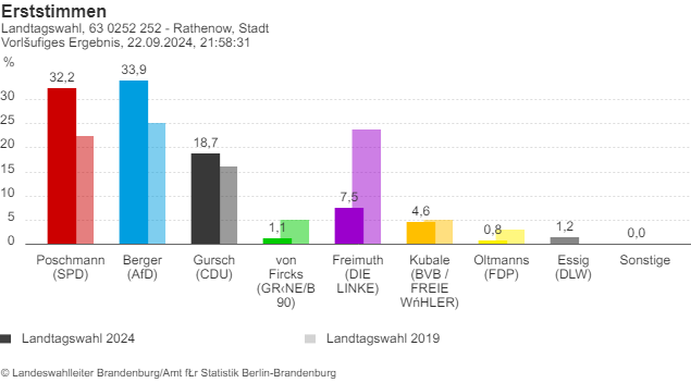 In Rathenow sicherte sich Kai Berger (AfD) mit 33,9 % der Erststimmen den Sieg, knapp vor der SPD mit 32,2 %.