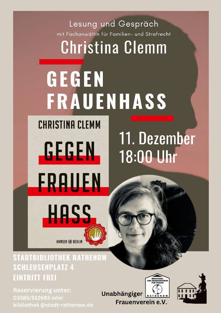 Zusammen mit dem Unabhängigen Frauenverein lädt der Förderverein der Stadtbibliothek Rathenow zur letzten Lesung in diesem Jahr. Zu Gast ist die Fachanwältin und Autorin Christina Clemm. Am kommenden Mittwoch, den 11.12.2024, liest sie aus ihrem Buch "Gegen Frauenhass". Beginn ist um 18:00 Uhr in der Stadtbibliothek Rathenow, Schleusenplatz 4.