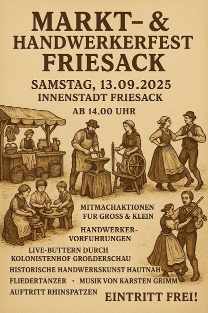 Friesack – Am Samstag, 13. September 2025, lädt die Stadt Friesack gemeinsam mit dem Kulturausschuss zum 2. Markt- und Handwerkerfest ein. Beginn ist um 14:00 Uhr auf dem Marktplatz.