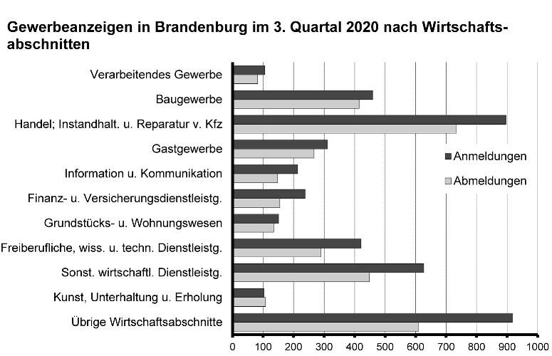 4 442 Gewerbe wurden im 3. Quartal 2020 in den Brandenburger Gewerbeämtern angemeldet, 6,2 Prozent mehr als im Vorjahr. Wie das Amt für Statistik Berlin-Brandenburg mitteilt, ging hingegen die Anzahl der Gewerbeabmeldungen um 13,1 Prozent auf 3 391 zurück. Der Wirtschaftsabschnitt „Handel; Instandhaltung und Reparatur von Kraftfahrzeugen“ verzeichnete mit 896 An- und 734 Abmeldungen die meisten registrierten Gewerbeanzeigen. Der Abschnitt „Erbringung von sonstigen wirtschaftlichen Dienstleistungen“ folgte mit 627 Anmeldungen und 448 Abmeldungen. Im Baugewerbe wurden 459 Gewerbe an- und 415 Gewerbe abgemeldet.