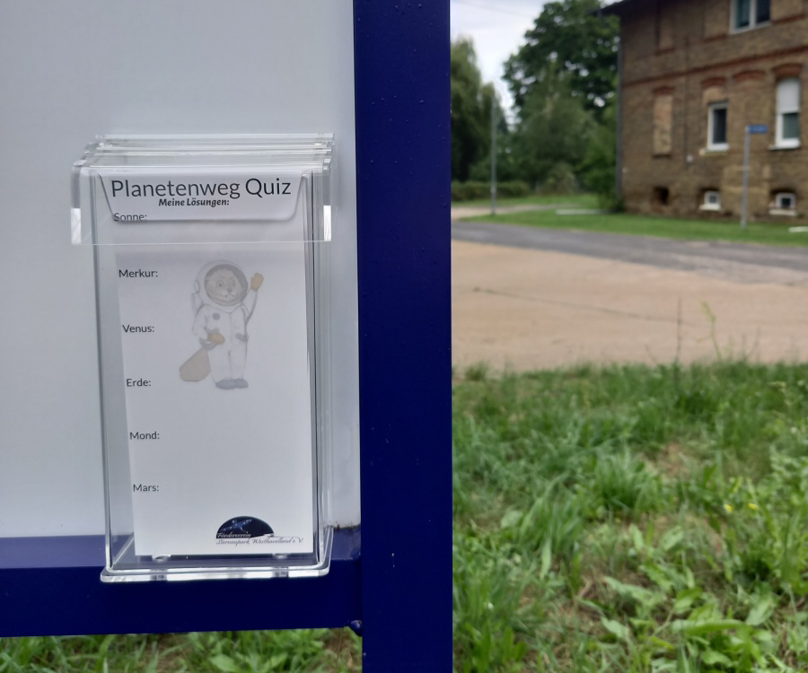 Der Planeten-Radweg von Kützkow nach Milow ist rechtzeitig zum Ferienbeginn mit einem Quiz gestartet. Am Naturparkzentrum in Milow, in Jerchel und Kützkow gibt es Quizkarten, mit denen Kinder – aber natürlich auch Ältere – ihr Wissen zu unserem Planetensystem testen können.