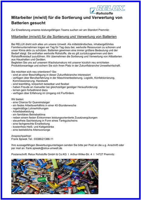 Mitarbeiter (m/w/d) für die Sortierung und Verwertung von Batterien gesucht