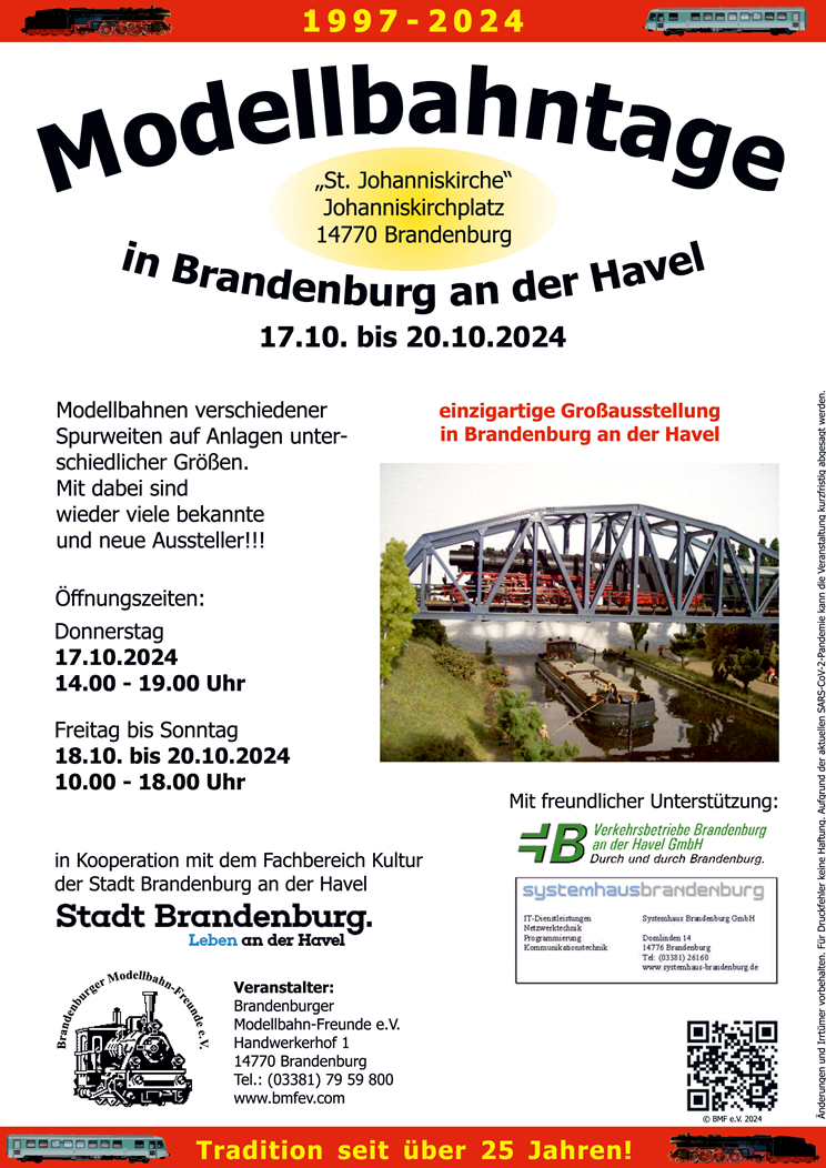 Die „Modellbahntage in Brandenburg an der Havel“ finden vom 17. bis 20. Oktober 2024 in der St. Johanniskirche am Johanneskirchplatz statt. Modelleisenbahner und Vereine aus der Region, darunter auch Gruppen aus Berlin und Magdeburg, präsentieren auf über 450 Quadratmetern ihre Anlagen und Dioramen. Das diesjährige Motto lautet „Kleine Spurgrößen ganz groß“, und es gibt Modelleisenbahnen in verschiedenen Spurweiten zu bestaunen.