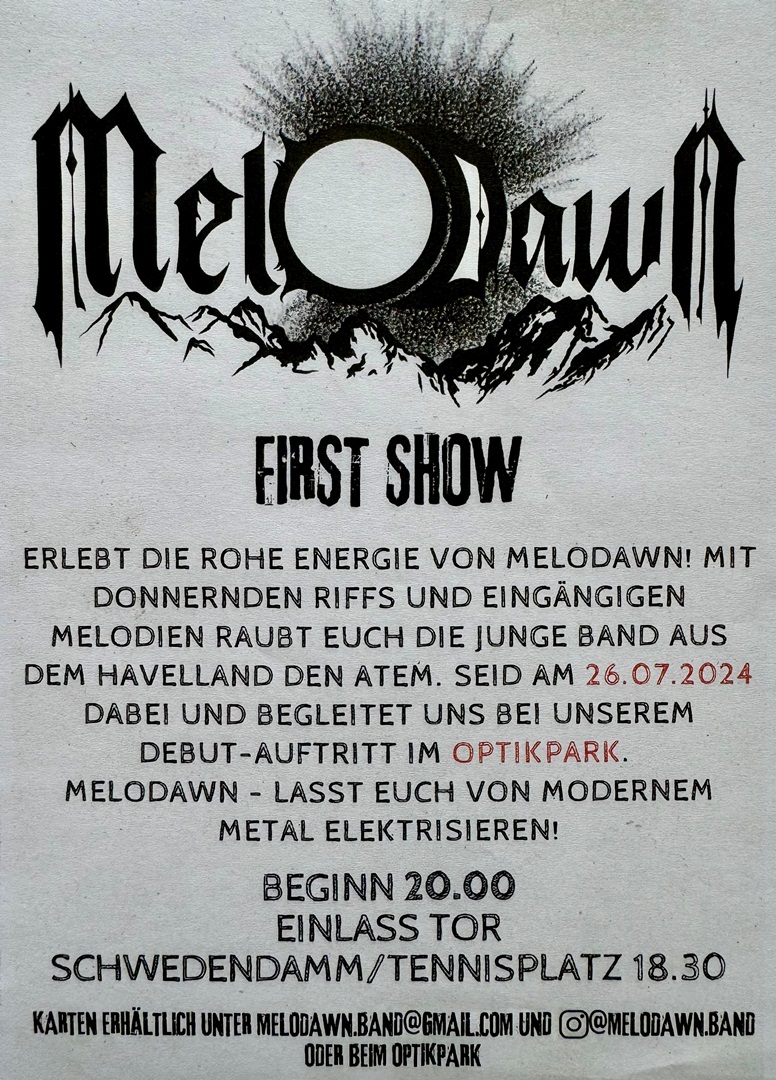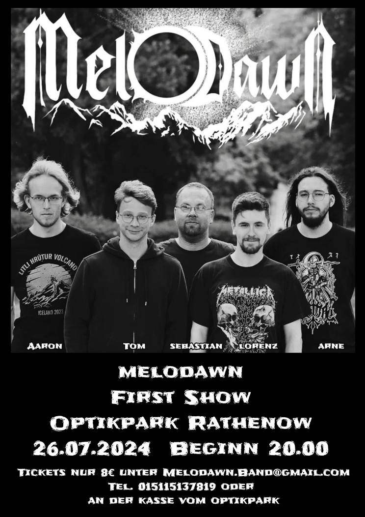 Mit donnernden Riffs und eingängigen Melodien, raubt Euch die junge Band aus dem Havelland den Atem! Seid am 26.07. dabei und begleitet "Melodawn" bei Ihrem