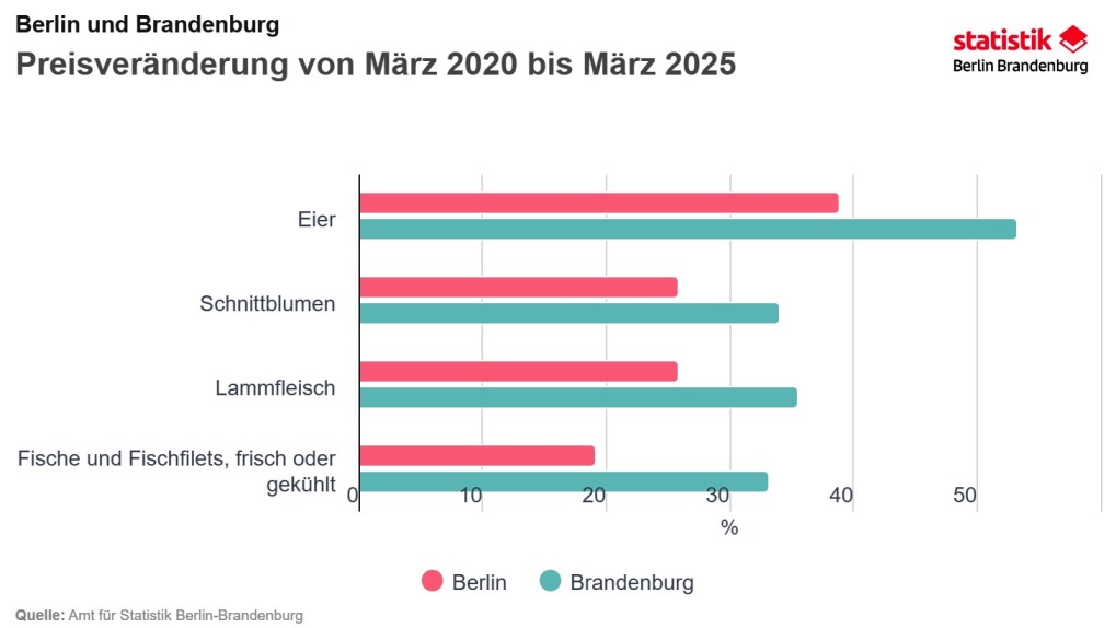 Vor dem langen Osterwochenende wird eingekauft, sei es für einen leckeren Osterbrunch, einen schönen Blumenstrauß oder den bunten Eierkorb. Doch das hat seinen Preis – und der ist deutlich gestiegen. Die Preise für Eier haben sich in Berlin seit 2020 um knapp 39 %, in Brandenburg sogar um 53,3 % erhöht. Auch andere typische Osterprodukte sind teurer geworden: Schnittblumen, Lammfleisch und Fisch verzeichneten deutliche Preissteigerungen. Damit ist Ostern 2025 – gemessen am hier vorgeschlagenem Warenkorb – gut ein Drittel teurer als noch vor fünf Jahren.