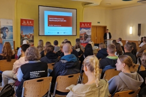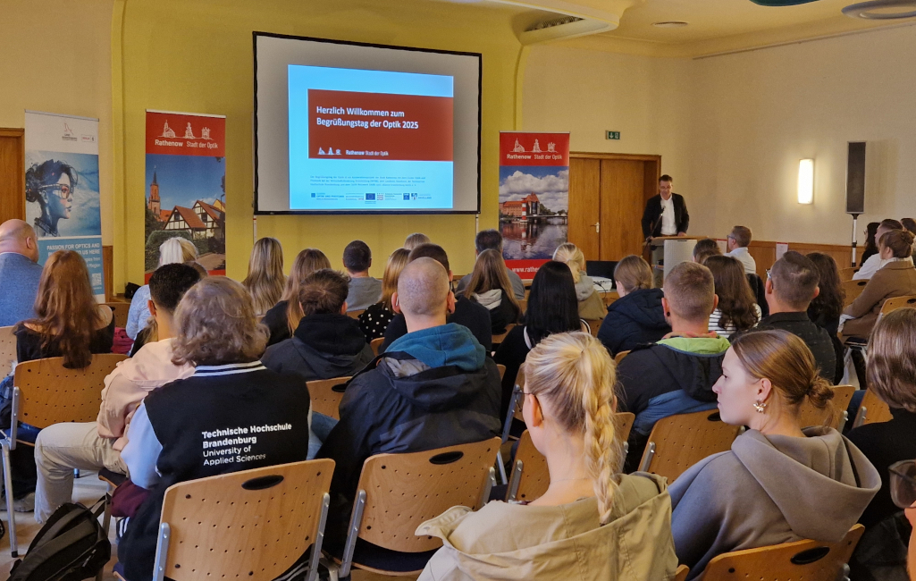 Traditionsgemäß wurden die Nachwuchsfachkräfte im Blauen Saal des Kulturzentrums Rathenow zuerst vom Bürgermeister der Stadt, Jörg Zietemann, begrüßt. In seiner Rede hob er hervor, dass der Begrüßungstag 2025 erneut zeigt, dass Rathenow nicht nur auf eine lange Tradition im Bereich der Optik zurückblickt, sondern darin bis heute ein modernes, innovationsstarkes Zentrum ist, in dem sich Ausbildung, Forschung und Industrie eng verzahnen. Prof. Dr. Justus Eichstädt von der Technischen Hochschule Brandenburg führte die Nachwuchstalente anschließend mit einem lebendigen Vortrag in die Rathenower Optikgeschichte ein.