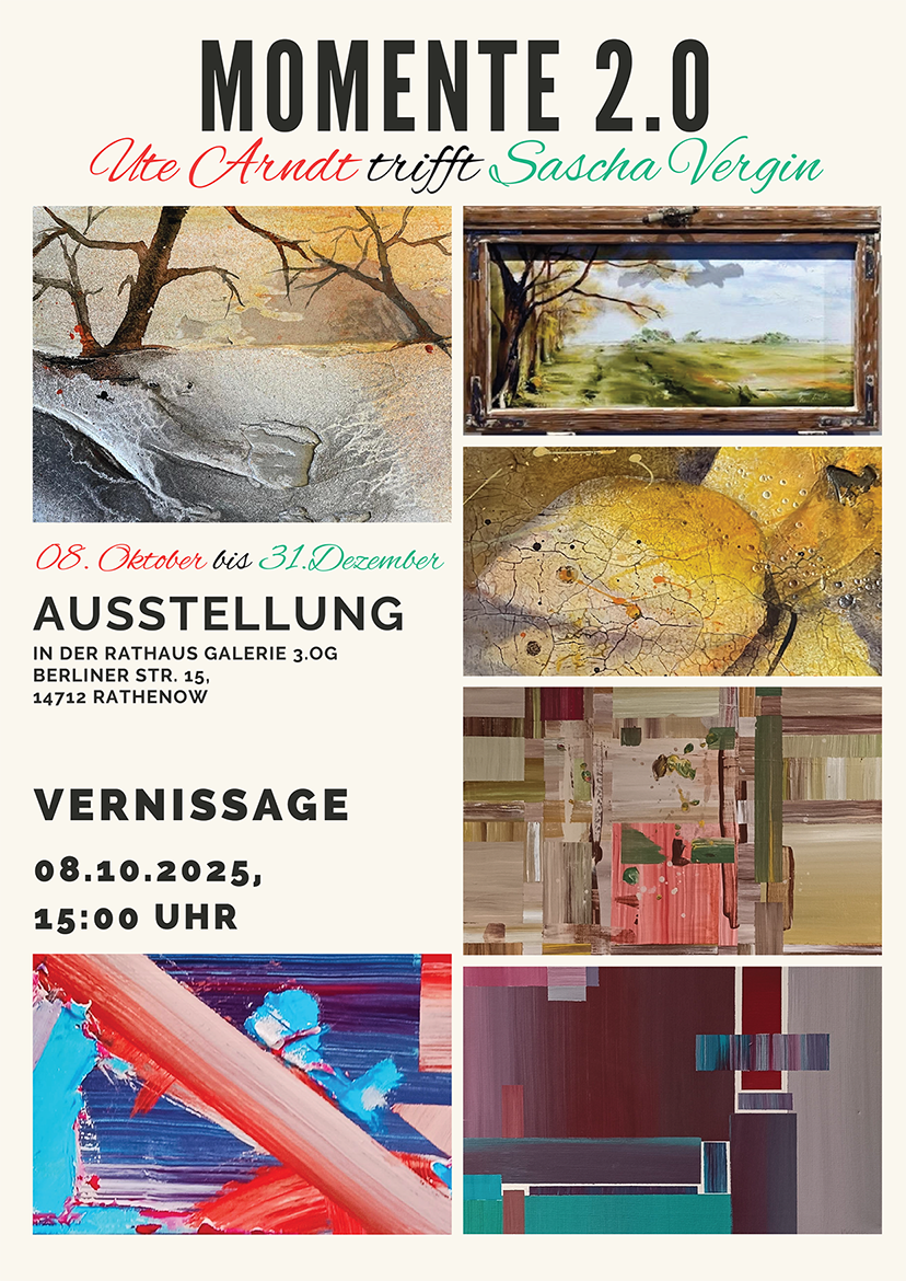Am Mittwoch, den 08.10.2025 wird um 15:00 Uhr in der Rathausgalerie in der 3. Etage die neue Ausstellung „Momente 2:0“ von Ute Arndt und Sascha Vergin eröffnet.