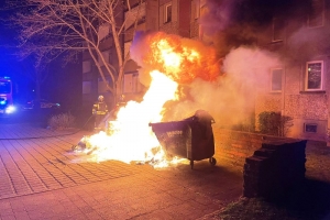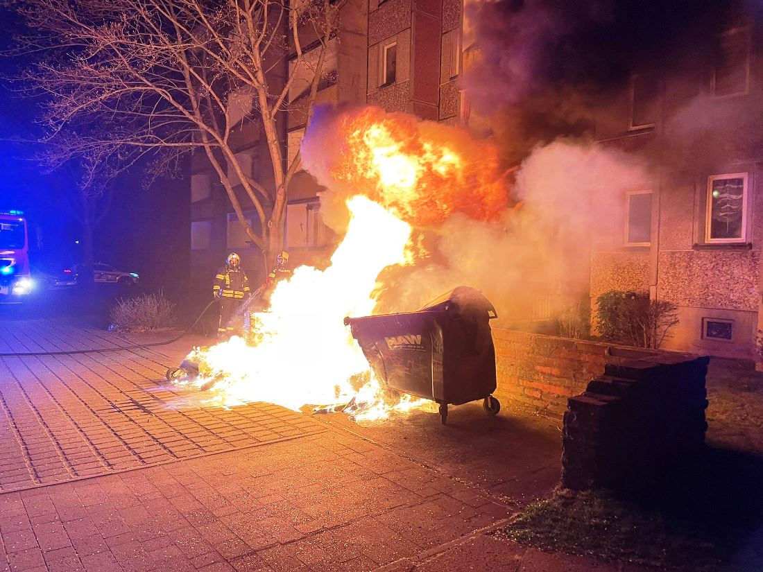 Über die Rettungsleitstelle wurde die Polizei in der vergangenen Nacht über den Brand einer Mülltonne in der Bahnhofstraße informiert. Die Polizeibeamten, die noch vor der Feuerwehr eintrafen, zogen die brennende Mülltonne von einem Gebäude weg und konnten so ein Übergreifen verhindern. Kurz darauf traf die Feuerwehr ein und löschte die brennende Mülltonne. Während der Einsatz noch lief, wurden weitere brennende Mülltonnen im Bruno-Baum-Ring bekannt. Dort waren vier Mülltonnen in Brand geraten, die ebenfalls von der Feuerwehr gelöscht wurden. Eine Absuche des Nahbereichs nach möglichen Tatverdächtigen verlief erfolglos.
