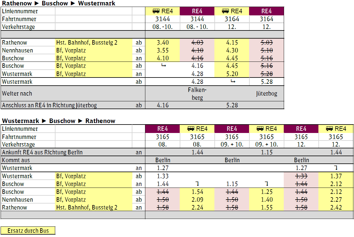 - RE 3164 (planmäßig 5.03 Uhr ab Rathenow) wird am 12. Februar von Rathenow bis Wustermark durch einen Bus ersetzt. Beachten Sie die 48 Min. frühere Abfahrt des Busses in Rathenow, um in Wustermark den planmäßigen Zug nach Jüterbog zu erreichen.
