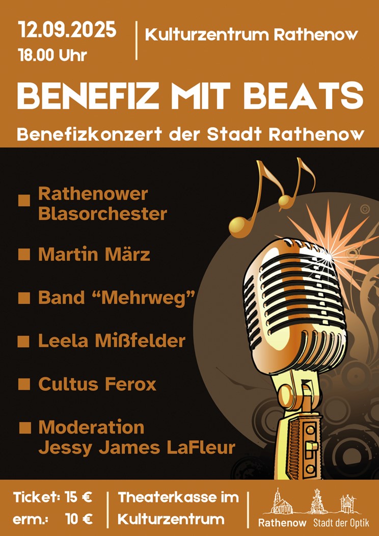 Am 12. September 2025 lädt Bürgermeister Jörg Zietemann gemeinsam mit dem Kulturzentrum Rathenow erstmals zu einem Benefizkonzert im Theatersaal ein. Beginn ist um 18:00 Uhr. Unter dem Motto „Benefiz mit Beats – Musik für die gute Sache“ soll die Veranstaltung künftig jährlich stattfinden, um Spenden für wichtige soziale Projekte in Rathenow zu sammeln.