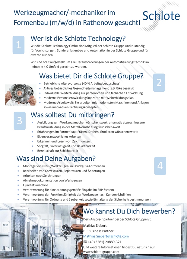 Schlote Technology GmbH: Werkzeugmacher/-mechaniker im Formenbau (m/w/d) in Rathenow gesucht!