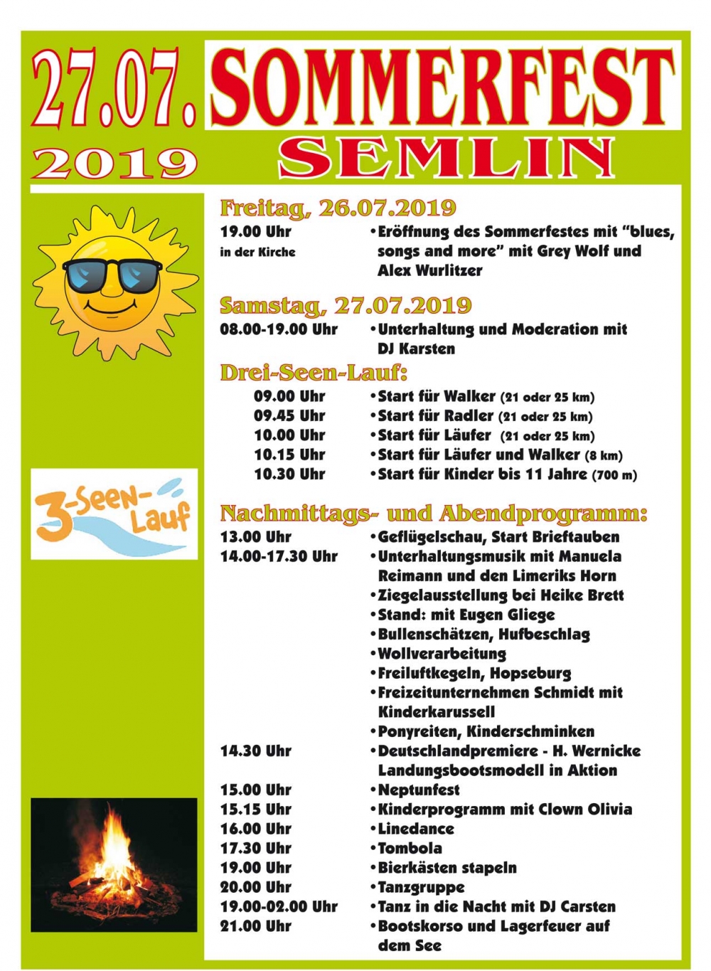 Am Samstag, den 27. Juli 2019 findet, das schon zu einer Tradition gewordene Semliner Sommerfest statt. Seit ein paar Jahren ist auch der 3-Seen-Lauf in dieses Fest integriert worden. Viele Sportler werden zum Lauf erwartet, aber auch für alle anderen Gäste wurde ein buntes Sommerfest-Programm vorbereitet.