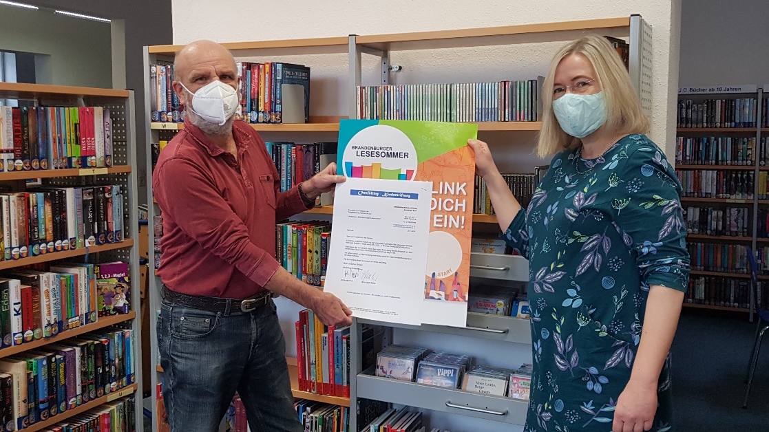 Für den Verein „Freunde und Förderer der Stadtbibliothek Rathenow“ nahmen am 17. Dezember 2020 der Vorsitzende Helmut Scholz und die Bibliotheksleiterin Ulrike Wünsch den Spendenscheck mit Freude entgegen. Ziel des landesweiten „Brandenburger Lesesommers“ ist es, Kinder und Jugendliche unabhängig von ihrer sozialen Herkunft zum freiwilligen Lesen zu motivieren und ihnen die Möglichkeit einer außerschulischen Eigeninitiative zu bieten. Schülerinnen und Schüler ab der vierten Klasse melden sich kostenlos an und lesen während der Sommerferien ihre Lieblingsbücher aus der vielseitigen Auswahl. Die Aktion hat einen hohen Bekanntheitsgrad bei Schülern, Eltern und Lehrern und wird in enger Zusammenarbeit mit den Schulen durchgeführt. Die Rathenower Stadtbibliothek nahm in diesem Jahr mit über 170 Schülerinnen und Schülern zum elften Mal am Projekt teil. „Mit der Spende der Ottefülling-Kinderstiftung können wir im nächsten Jahr eine noch größere, spannende Bücherauswahl anbieten und wieder ein gelungenes Abschlussfest gemeinsam mit allen Teilnehmenden feiern“, so Ulrike Wünsch.
